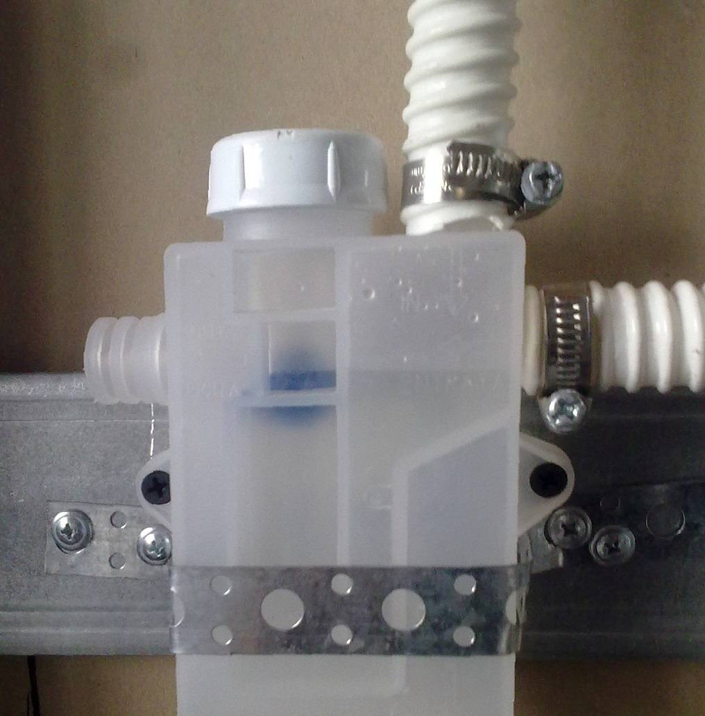 Сверху на отверстие манжеты опускается теннисный шарик. Нижняя часть трубы вставляется в канализационную трубу, а в верхнее отверстие вставляется шланг, отводящий конденсат из кондиционера. Принцип действия такого сухого гидрозатвора заключается в следующем.