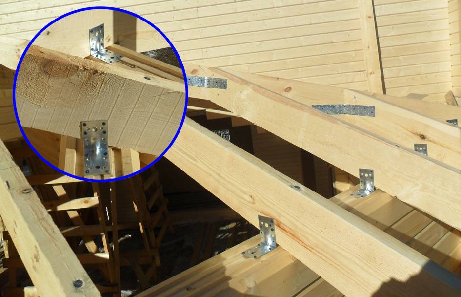 Также возможно применение специальных пропилов. Они делаются в несущем бревне. Однако такой вариант возможен только в том случае, если угол ската относительно невелик. Мало того, в наличии должны быть промежуточные опоры.
