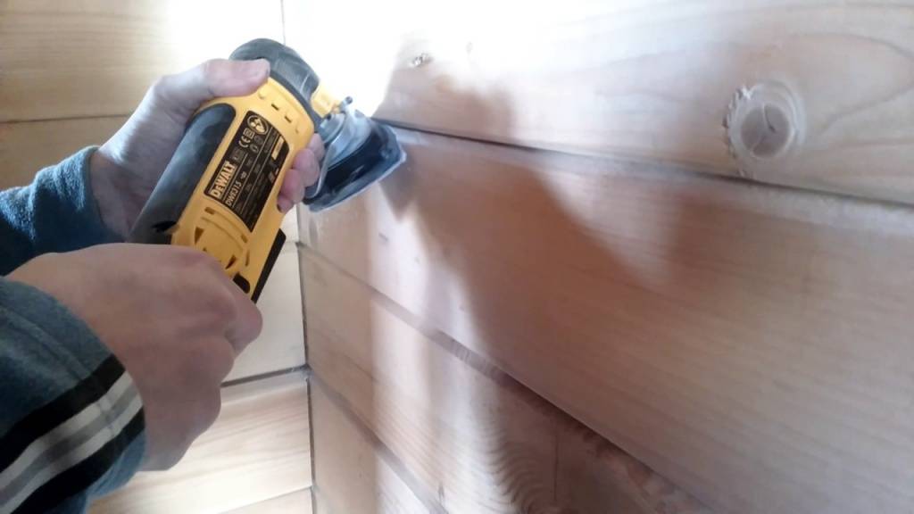 Основную работу выполняют шлифовальной машинкой – выравнивают плоские поверхности. Инструмент надёжен, отличается высокой производительностью. Работа не потребует больших затрат физических сил. Однако профилированный брус с круглёнными краями обрабатывать таким способом неудобно, лучше взять планетарную шлифмашину.