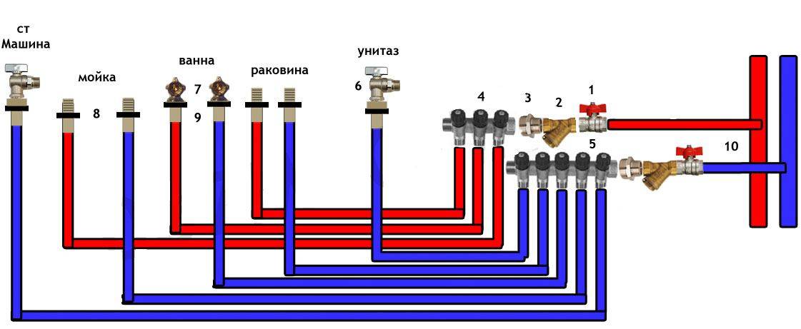 Из плюсов, давление распределяется равномерно, даже если включить все краны, бытовую технику, напор останется мощным. Можно отключать ненужную, редко используемую технику, снимать и ремонтировать ее, производить подключение поэтапно. В последнем случае на этапе проектировки нужно запланировать необходимое количество отводов.