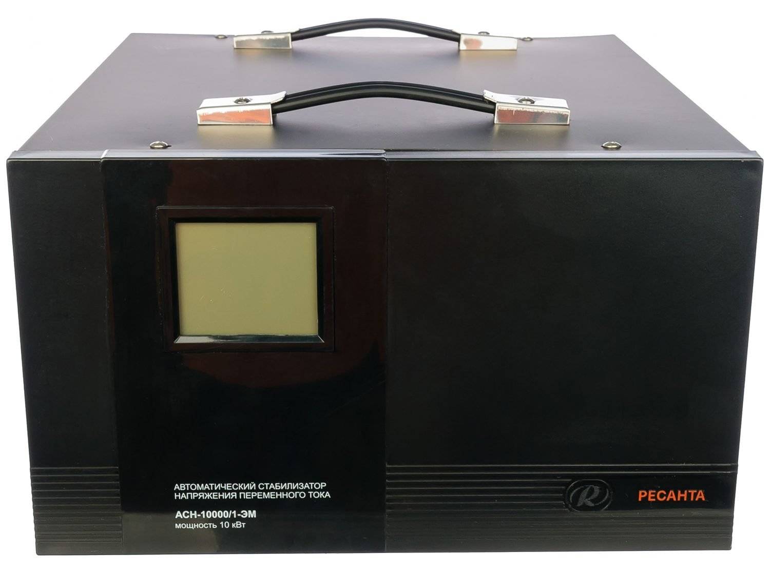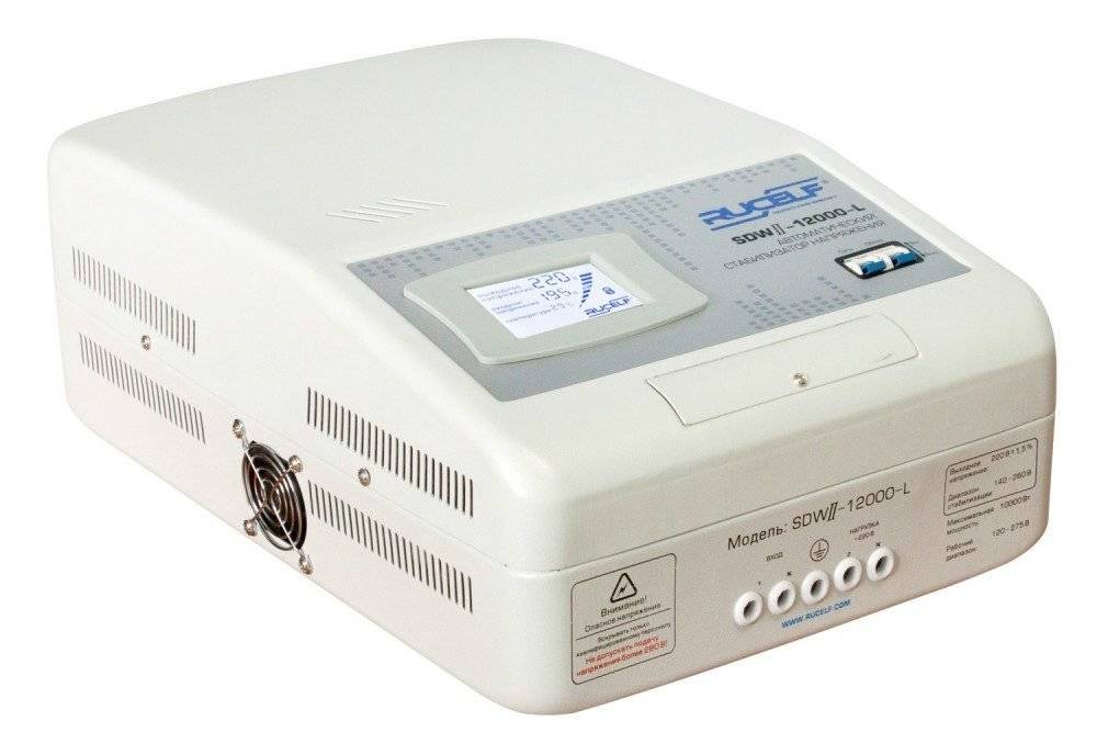 Мощный стабилизатор с классической компоновкой деталей. Облачён в прямоугольный металлический каркас тёмного цвета, на верхней панели которого расположены ручки для переноски блока. Отверстие для вентилятора, разъёмы подключения и кнопки управления размещены на задней панели. Суммарная мощность нагрузки не превышает 10 кВт, а точность стабилизации 2%. Встроенные в корпус цифровые амперметр и вольтметр помогут понять пользователю, в каком режиме работает устройство. Прибор оснащён байпасом ручного типа, при помощи которого можно переключать потребителей на сеть переменного тока напрямую, без стабилизации. Может работать при высоких температурах (вплоть до 45 градусов по Цельсию). Стоимость в магазине около 14 с половиной тысяч рублей.