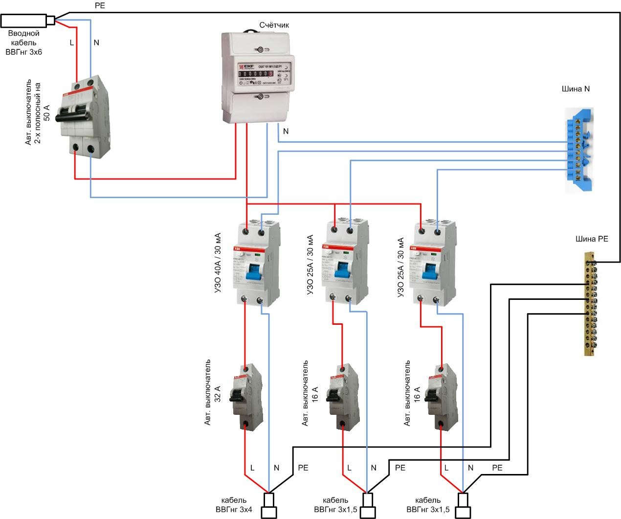 На входе в дом установлен автомат номиналом 40А, что соответствует максимальной мощности энергопотребления порядка 8 кВт. Стабилизатор РЕСАНТА АСН-10000/1-Ц несколько мощнее, однако для уменьшения нагрузки на прибор через него подключены не все потребители. В результате получилась следующая ниже схема электромонтажа.