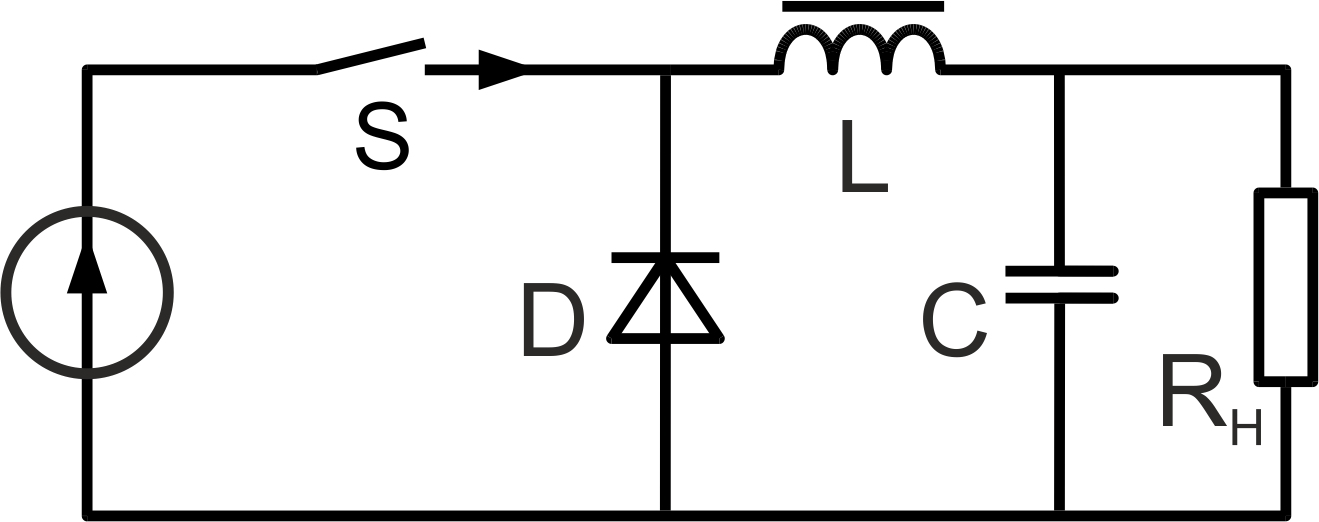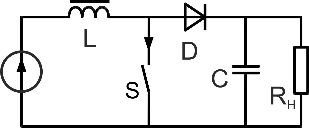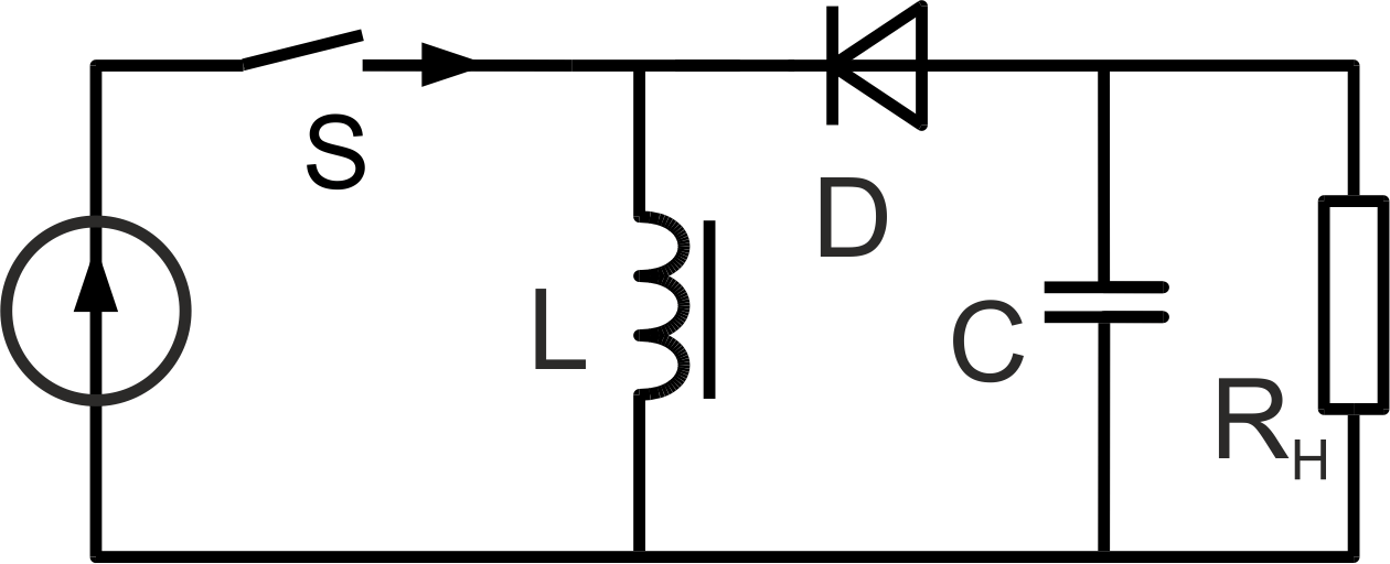Большинство микросхем для питания светодиодов выполнены в виде импульсных преобразователей напряжения. Преобразователи, в которых роль накопителя электрической энергии выполняет катушка индуктивности (дроссель) называются бустерами. В бустерах преобразование напряжения происходит за счет явления самоиндукции. Одна из типичных схем бустера приведена на рисунке.