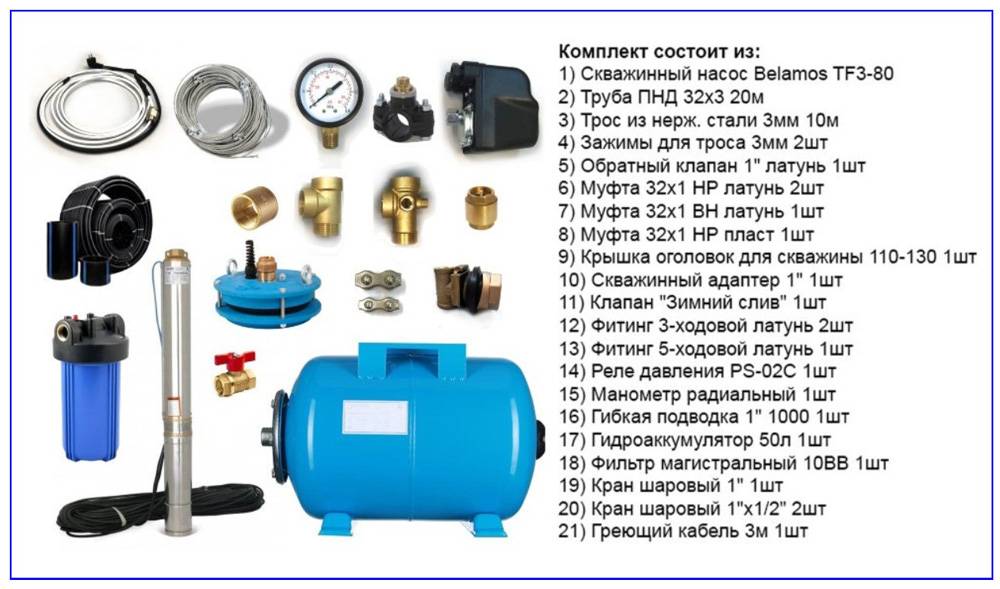 Рис. 5 Оборудование и комплектующие для обеспечения водоснабжения из скважины глубиной 50 м