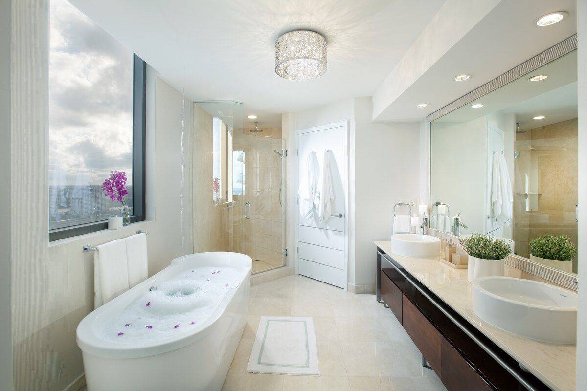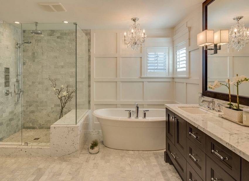 Тщательно выбирайте тип верхнего освещения для ванной, чтобы не перегружать пространство, а добавить очарование. Основной источник света должен соответствовать остальным световым элементам и стилю всего интерьера.
