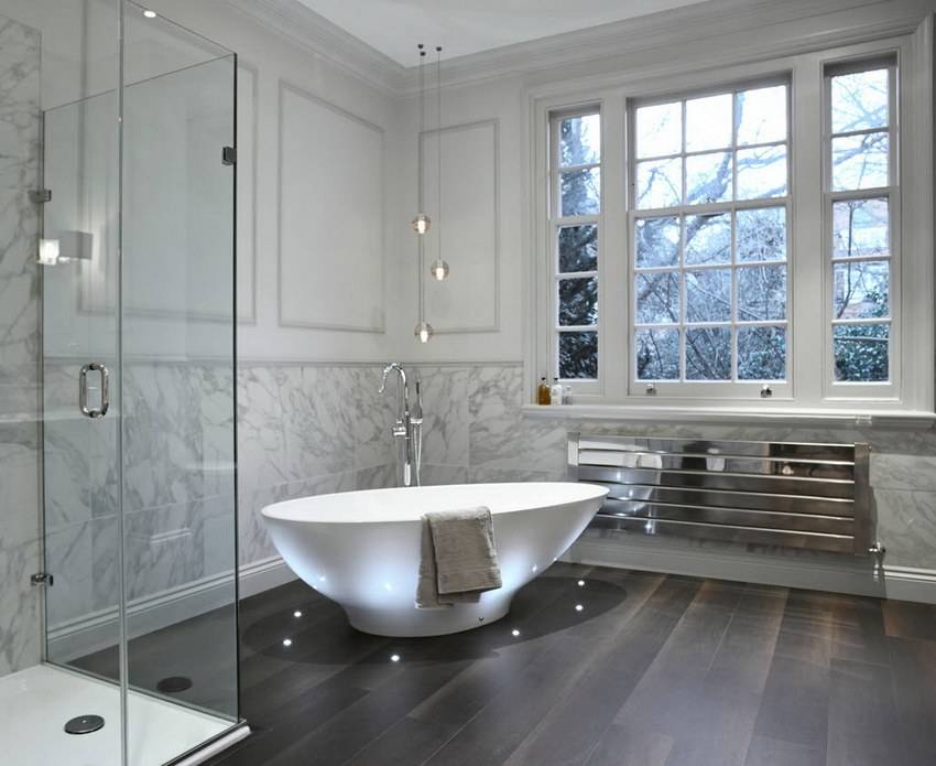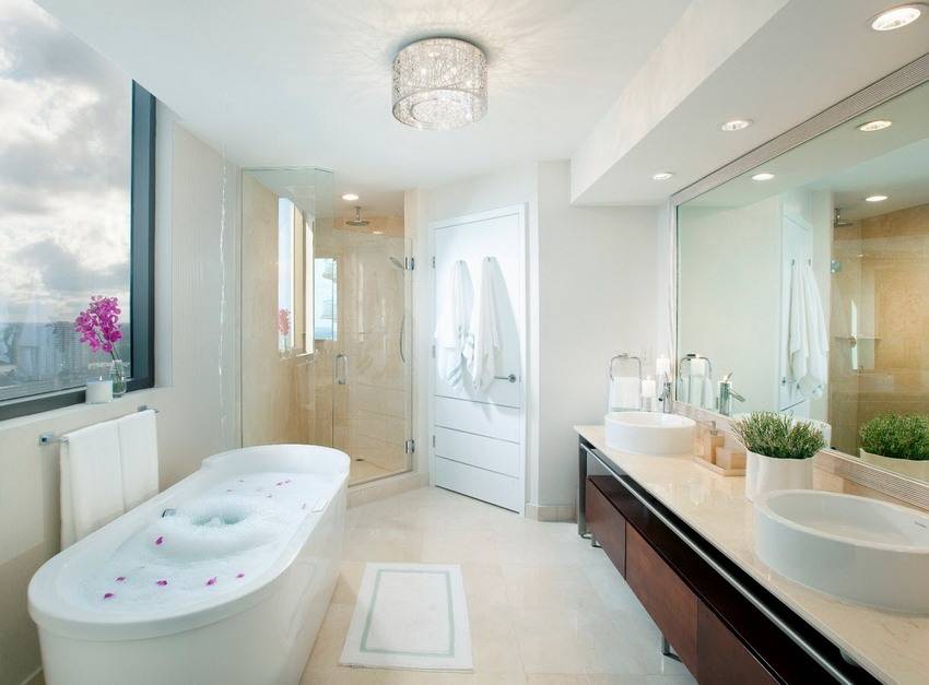Размещение светильников в ванной со светодиодными лампами является наиболее распространенным вариантом среди ремонтов с большим бюджетом, поскольку такие изделия стоят достаточно дорого и требуют особого устройства электропроводки. Основным преимуществом этих изделий является полная безопасность, так как они работают от напряжения 12 или 24 вольта. Ещё одним положительным свойством можно назвать отсутствие нагрева при работе, что позволяет их использовать в светильниках любого типа и в любой зоне.
