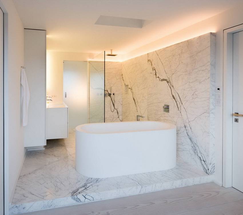 Что же касается купальной зоны, то она, является противоположностью зеркальной. Всё чаще принятие ванны, или душа воспринимается не как гигиеническая необходимость, а как отдых, и получение удовольствия. Для того чтобы отдых получился не только физическим, но и эстетическим, ванная должна быть отделена от всей остальной сантехники хотябы зонально, при помощи света. Некоторые производители ванн предлагают своим покупателям ванны, оснащённые автономной подсветкой.