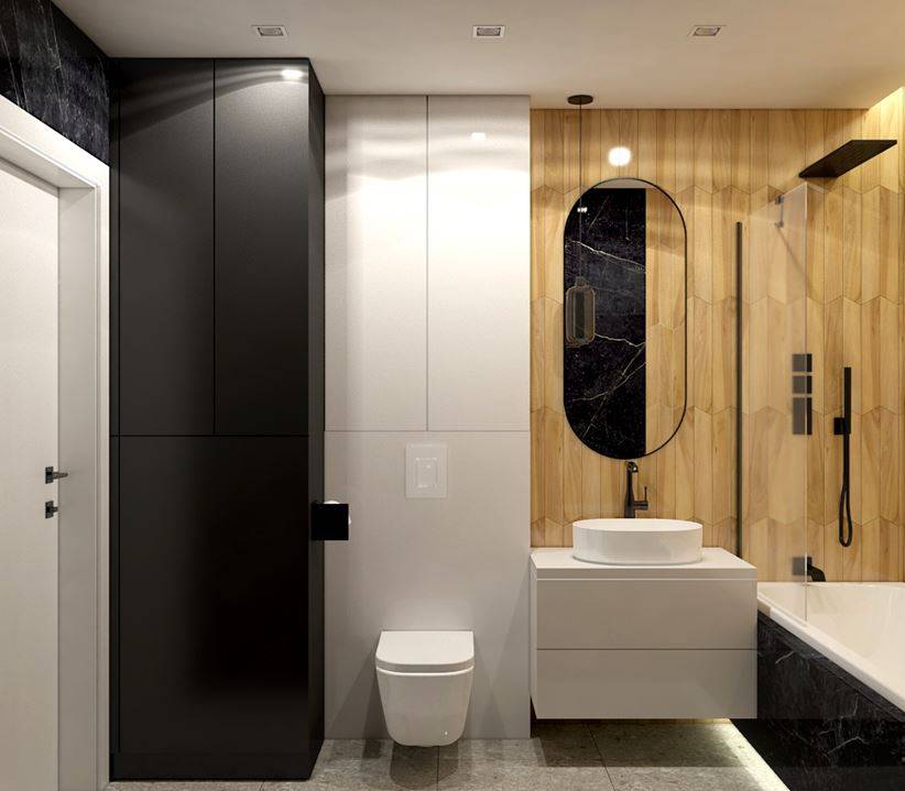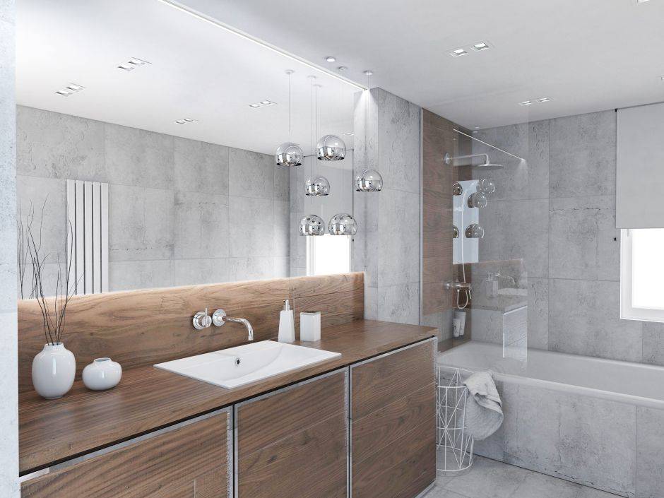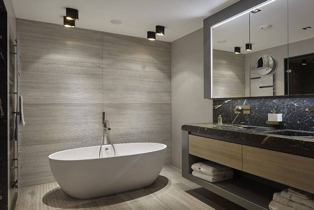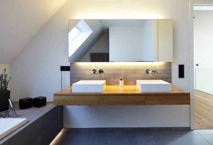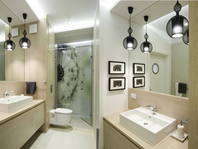 В ванных комнатах есть места, которые особенно требовательны с точки зрения интенсивности света и качества. Особенно важна зеркальная зона. Источник света должен симметрично и мягко освещать лицо человека, смотрящего на себя в зеркало, он не должен падать сверху на голову, потому что тень создаст эффект усталости и мешков под глазами. Он также не должен ослеплять, поэтому сильные прожекторы не очень хорошая идея.