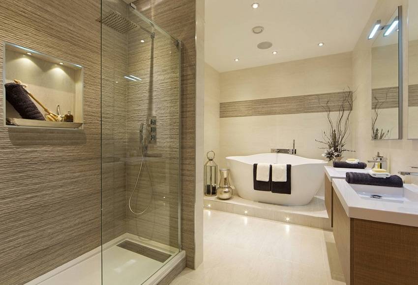 Особое внимание следует уделить осторожному освещению отдельных мест в ванной комнате, например, освещению полок или полов. Сам источник света не бросается в глаза, но тонко выявляет красоту элементов оборудования — например, интересную стеклянную мозаику