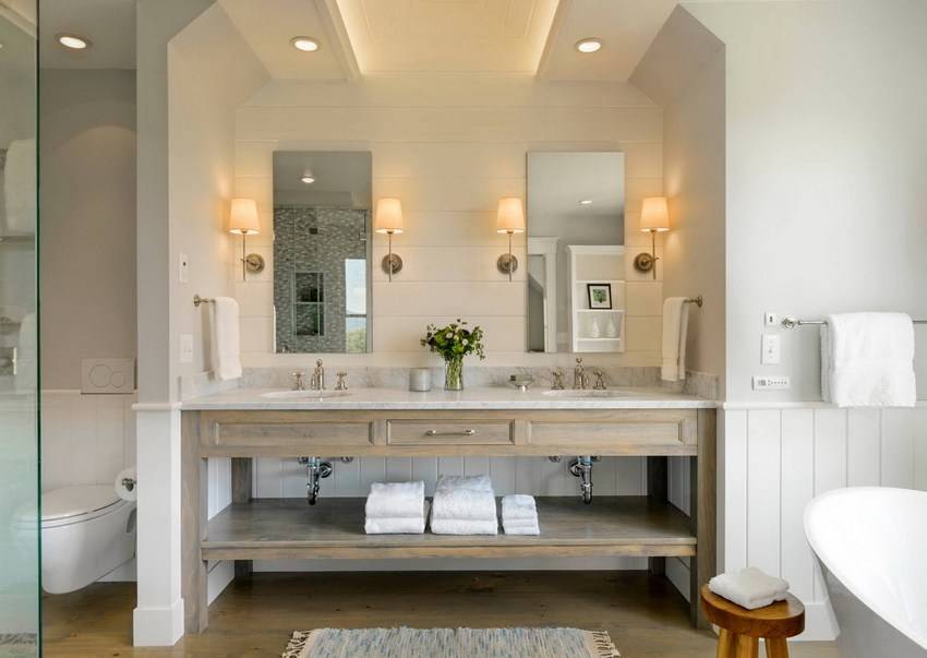 Самое главное в среднем уровне освещения – выделить важные рабочие зоны. Обычно это умывальник и зеркало. Установите с двух сторон по бокам симметрично два светильника в верхней части зеркала. Если оно небольшого размера, то и светильники выбирайте тоже поменьше.