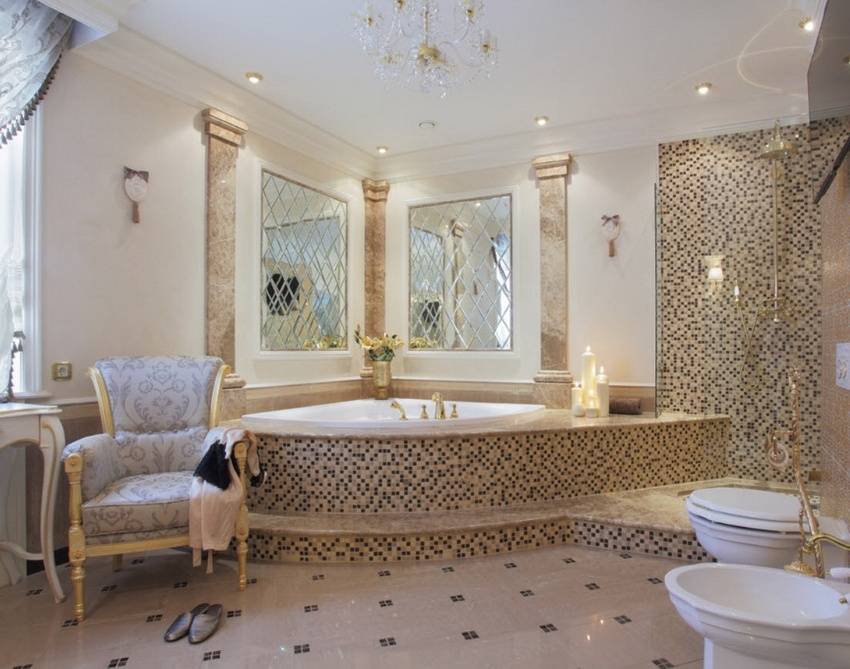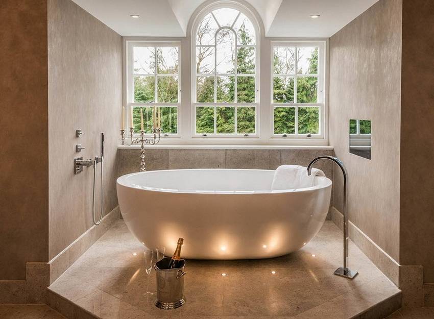 Декоративное освещение может быть выполнено в качестве напольных точечных светильников по периметру ванны. Если в ванной предусмотрен декор в виде ступеней, ниш или пьедестала, то напольные светильники оригинально подчеркнут их.