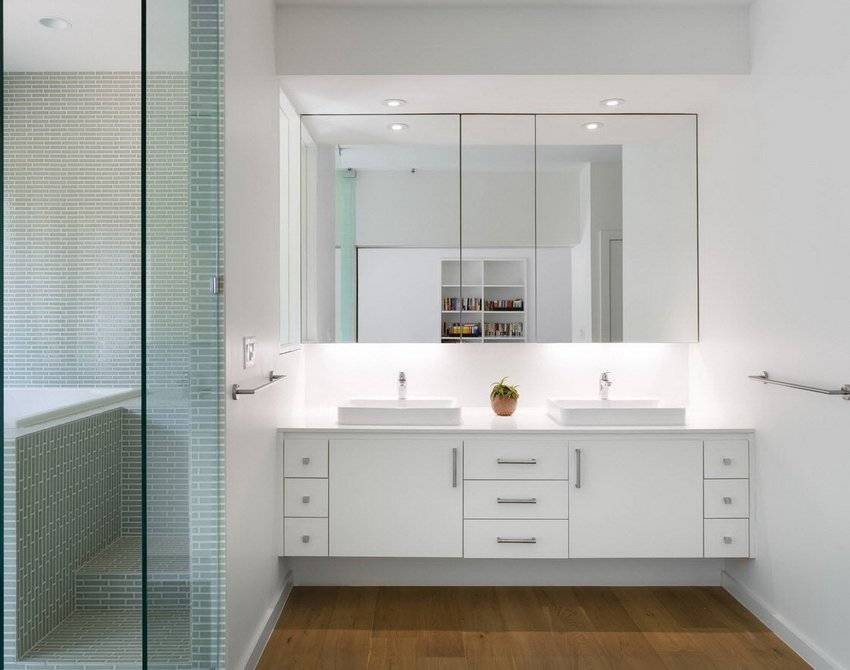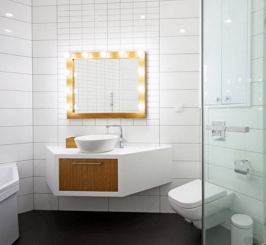 Поэтому рассмотрим светорассеивающие лампы — например, настенные бра или лампы, свисающие с потолка, на высоте, оптимально освещающей лицо. Если у вас очень маленькая ванная комната, вы также можете рассмотреть зеркала с подсветкой рамы или шкафы с зеркальными дверцами и встроенным освещением по бокам.