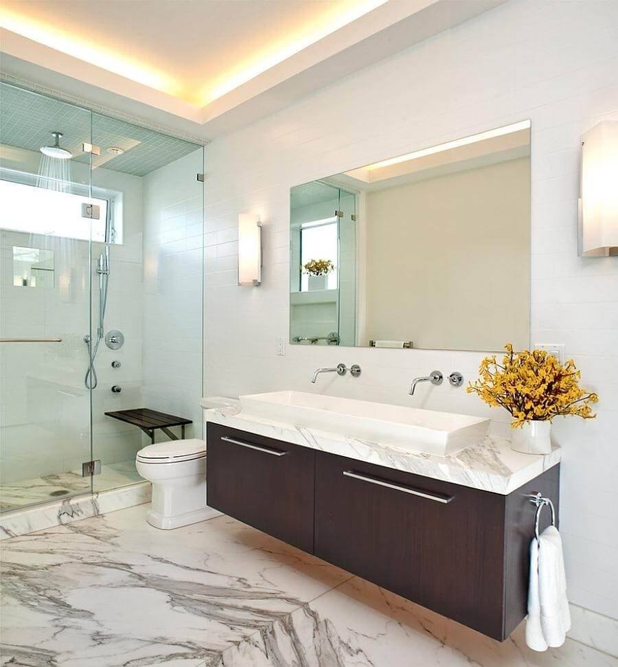 Большинство ванных комнат имеют один основной источник света, обычно расположенный на потолке в центре комнаты. Независимо от того, выбираете ли вы неброский плоский потолок, осветительную ленту, лампу с абажуром или эффективную люстру — основной свет должен быть достаточно интенсивным, чтобы освещать всю ванную комнату.