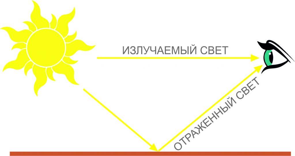 - Отраженный свет– это свет, “отскочивший” от поверхности объекта. Когда мы смотрим на какой-либо предмет, не являющийся источником света, мы видим именно отраженный цвет.