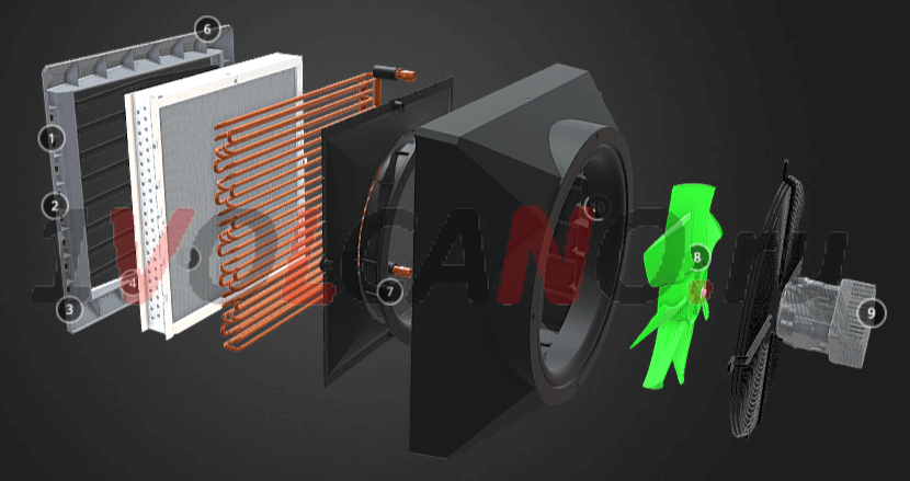 В каждом Volcano, под EPP или пластиковым ABS корпусом установлен медный теплообменник с алюминиевыми ламелями волнистой формы (для увеличения площади поверхности) и мощный, современный, мало шумный осевой двигатель, с 1 января 2018г только ЕС.