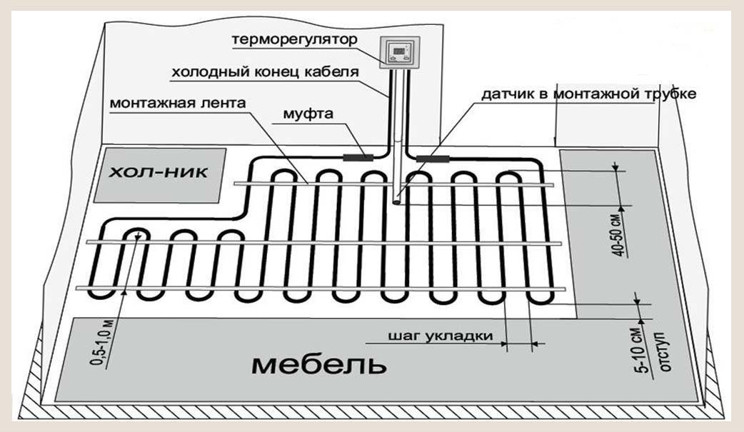 В каждом участке, с учётом предназначения зоны и желаемого уровня нагрева, контур может располагаться по типу змейки или улитки.