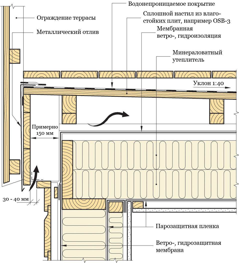Как результат, вы получаете теплую, надежную, кровлю, способную выдержать пес террасного покрытия и всего того, что будет находиться на нем.