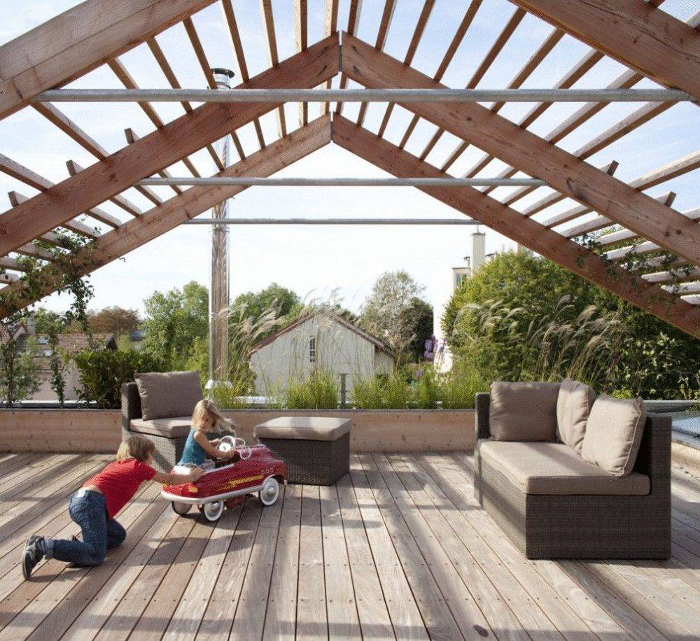 Терраса на плоской кровле дома, гаража или бани – это оригинально, стильно и удобно.