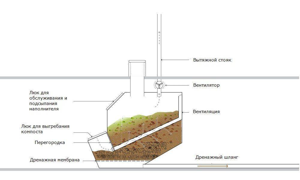 - в процессе компостирования образуется углекислый газ, который выводится через систему вентиляции.