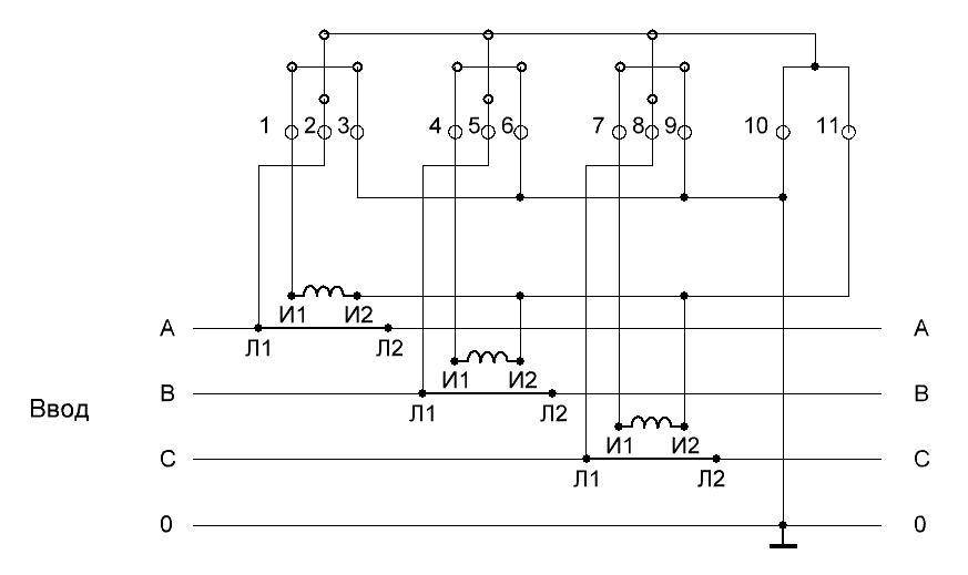 Контакты Л2 всех ТТ подключаются к нагрузке. Теперь рассмотрим подключение остальных контактов: