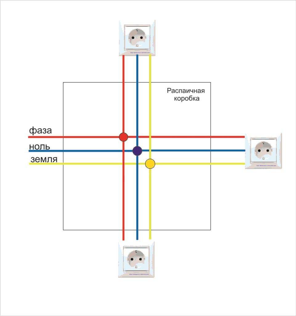 Если все же принято решение устанавливать три розетки в разных подрозетниках, то они должны быть подключены в соответствии схеме, приведенной выше. В этом случае возможно придется прокладывать дополнительные участки кабеля и здесь нужно учесть, что прокладываются они исключительно горизонтально или вертикально. Диагональная прокладка недопустима.