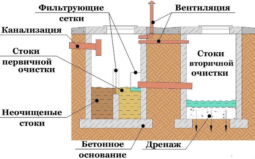 Схема автономной канализации для частного дома с использованием трех колодцев из бетонных колец