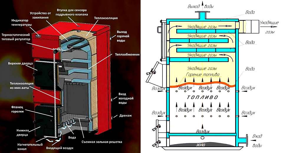 Основу конструкции составляет топка, состоящая из портала для загрузки, колосников для организации воздухоподачи и зоны дымоотведения. Зола собирается в отдельную емкость. Для теплообмена предусмотрена водяная рубашка, в которой циркулирует жидкость. Терморегуляция и контроль нагрева выполняются заслонкой и шиберами.