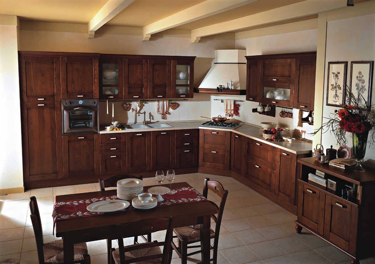 Классический дизайн угловых кухонь предусматривает наличие равномерных пропорций, прямолинейной геометрии и симметричности. Доминирующим материалом выступает МДФ, имитирующая разнообразные породы дерева. Обязателен декор, придающий гарнитуру праздность.