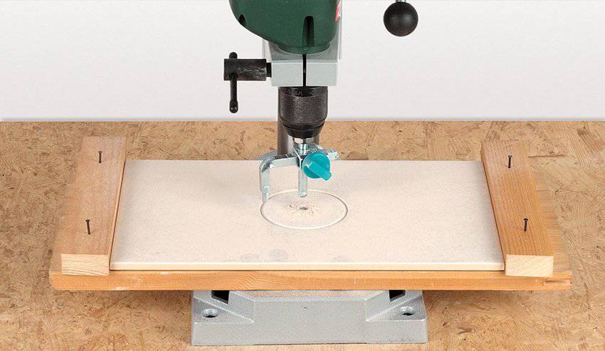 Если в плитке необходимо высверлить отверстия, тут понадобится мощная дрель с насадками: «коронка», «балеринка» и « перо», которые предназначены для работ со стеклом и керамикой.