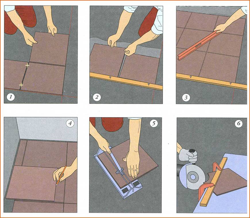 Например, после надреза линии обычным роликовым плиткорезом, часто самопроизвольно откалываются углы. Кроме того, размер напольной облицовки достигает больших величин, она может банально не поместиться в плиткорез. Поэтому используются следующие способы раскроя: