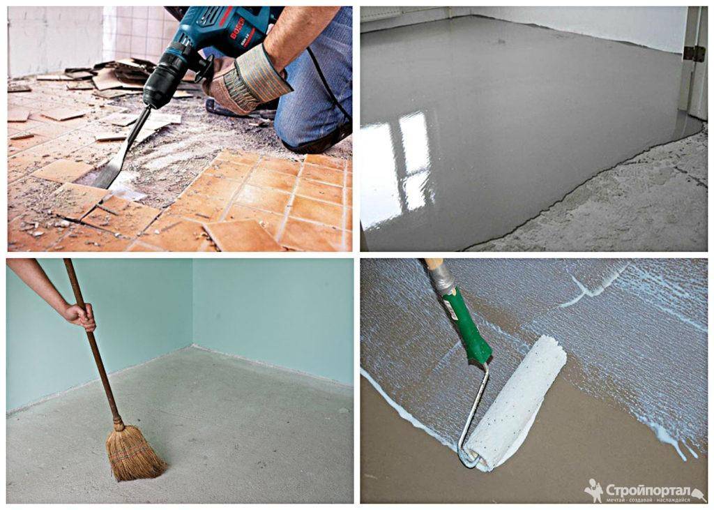 Грунтовка глубокого проникновения поможет не только удалить пыль с пола, но и увеличить площадь сцепления клея с основанием.