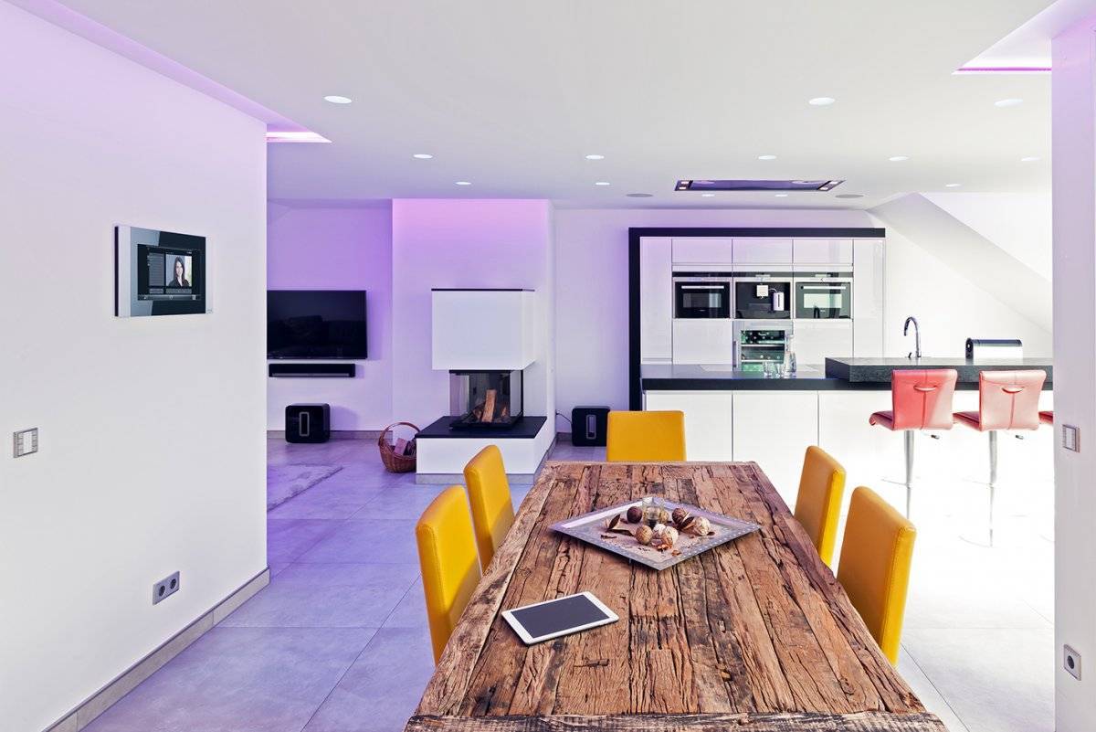 Умные технологии базируются на свободе изменений дневных, ночных, утренних и вечерни сцен. Освещение можно настроить на автоматические изменения по времени суток.