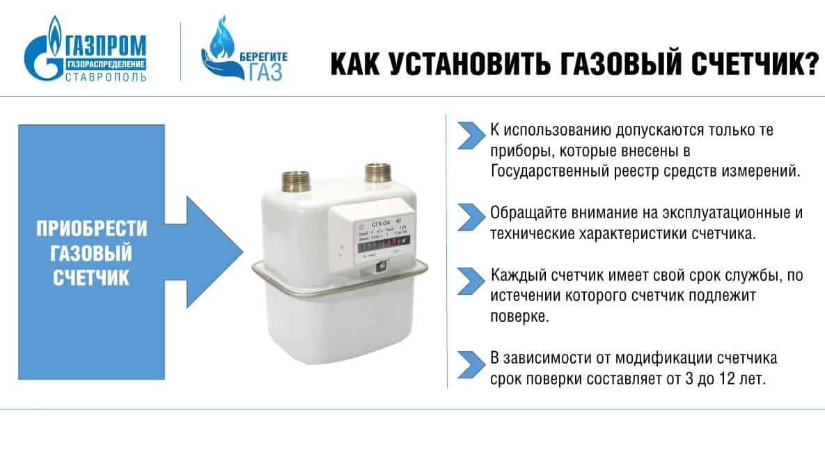 Самостоятельно взять и установить газовый счетчик, без уведомления газоснабжающей организации нельзя. К тому же не стоит забывать и о том, что любое газовое оборудование, будь то плита или счетчик, является объектом повышенной опасности, поэтому контроль над установкой счетчика газа необходимо доверить исключительно специалистам из газовой службы.