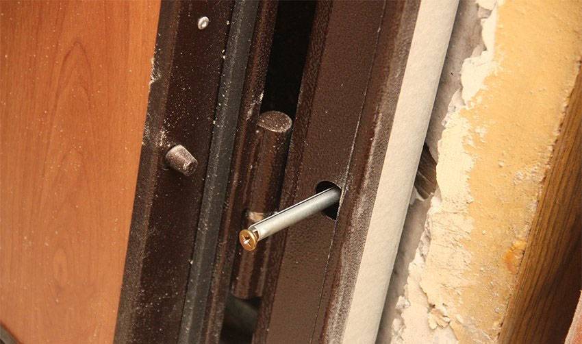 Окончательная фиксация дверного полотна проводится при помощи саморезов длиной до 15-ти сантиметров или дюбелей.