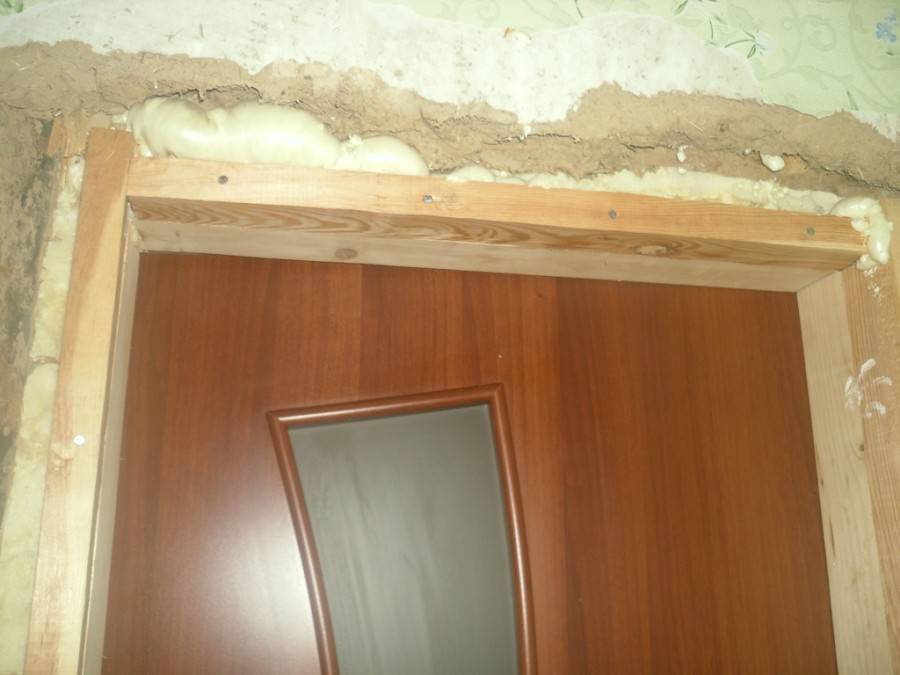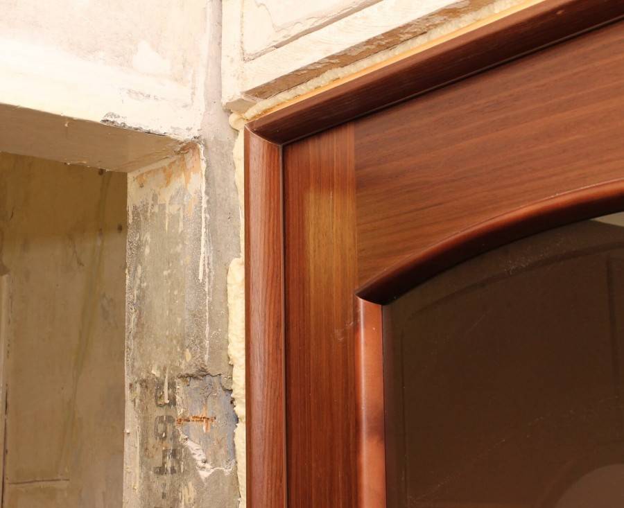Дело в том, что в процессе монтажа двери должны устанавливаться только вертикально и равняться на одну из плоскостей стены, а это приведет к тому, что она верхом или низом неизбежно выйдет за границы неровной стены. Это приведет к тому, что наличник, прикрепленный к дверной коробке на финальной стадии работы, будет в одном месте примыкать к стене, а в другом — отходить от нее. Конечно, это будет выглядеть некрасиво, и, чтобы уберечься от подобных негативных эксцессов, нужно устанавливать двери после отделочных работ со стеной.