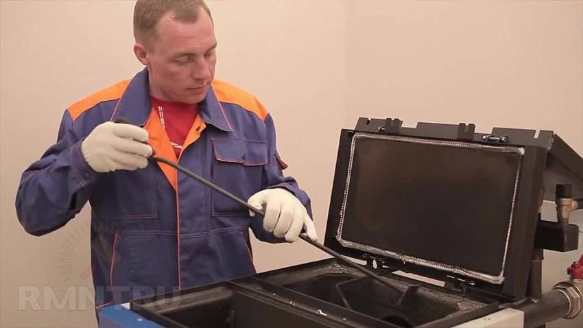 - Очистить скребком поверхности топки и загрузочной камеры.