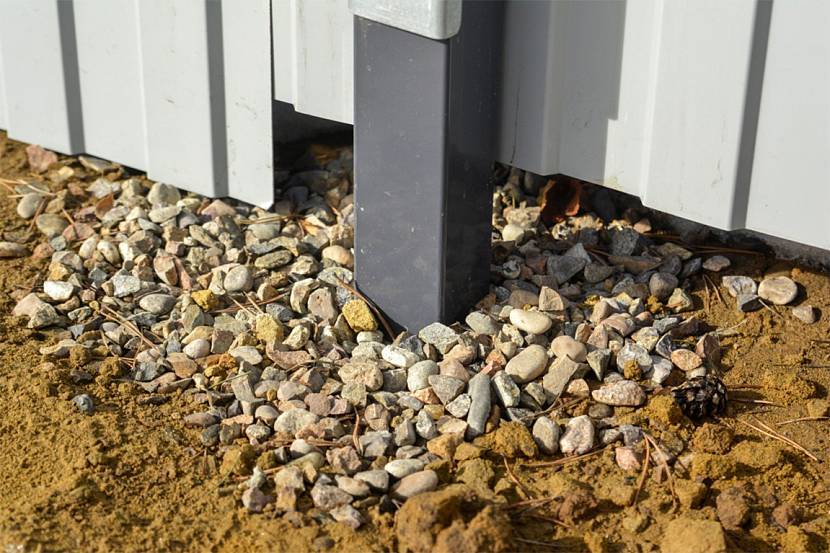 Для того чтобы избежать промерзания конструкции, и соответственно, её быстрой порчи, монтаж столбиков производится после предварительного засыпания на дно лунки щебня, слоем 15−20 см. После, установка продолжается бетонированием.