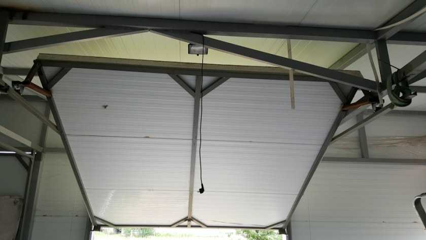 - На потолке. Используется под полотна небольших размеров, в гаражах, рассчитанных на один легковой автомобиль. Фиксируется на потолке на расстоянии 1‒2 м от проема. Трос крепится вверху створки с помощью рычага, что создает тягу. С помощью этого троса дверь открывается.