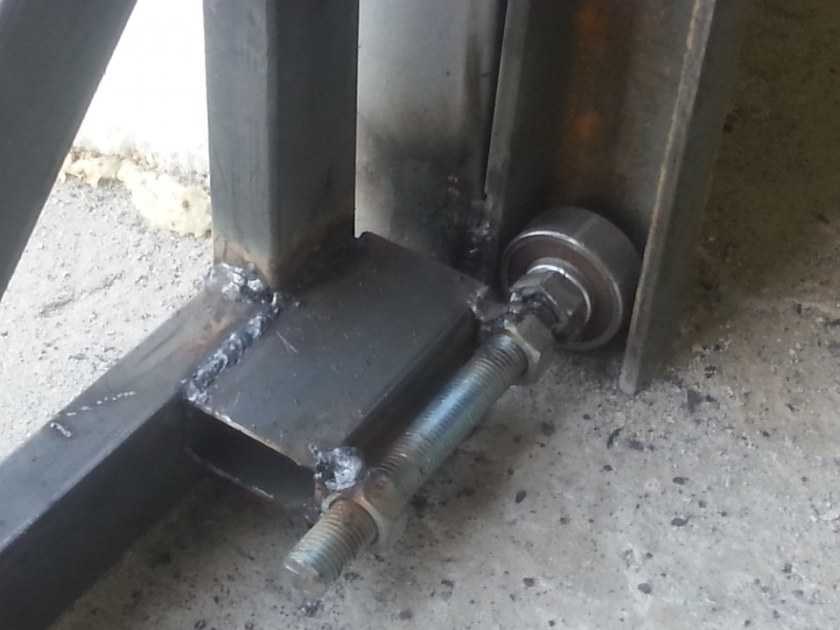 Направляющей для ролика будет служить уголок. Его привариваем к балке над воротами. Чтобы закрепить ролик к складной створке необходимо к ее каркасу с края, где она не прикреплена навесом к стойке, приварить пластину. К ней приваривается металлический закаленный штырь.