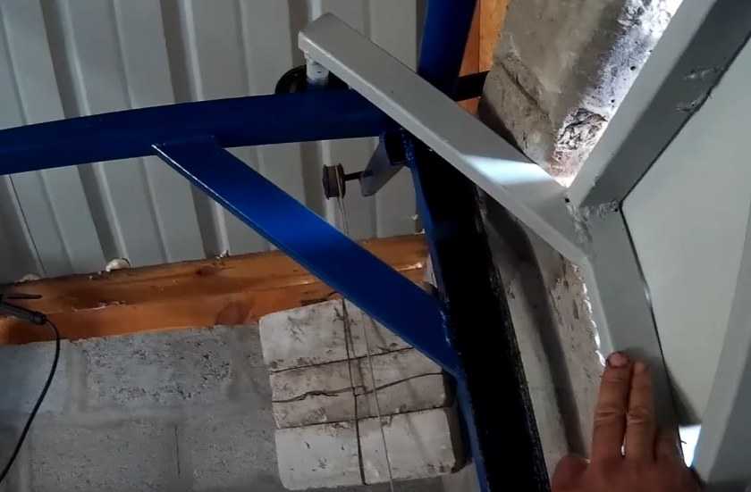 Один конец троса лебедки крепят к низу створки, потом трос пропускают через механический блок, расположенный на потолке, ближе к противоположной стене. К другому краю монтируют груз (противовес). При открытии ворот он опускается, при закрытии – наоборот. Причем масса противовеса должна быть больше, чем самой створки.