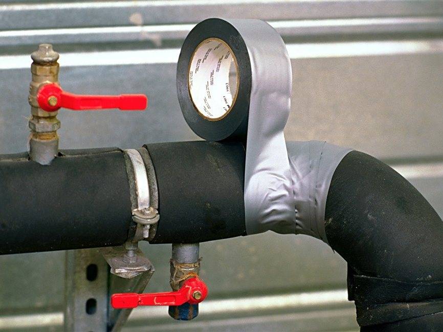 Поверхность обматывается слоем сантехнического скотча, который удерживает изолятор и обеспечивает защиту от внешних факторов. Изгибы магистралей закрываются фасонными элементами стандартного типа.