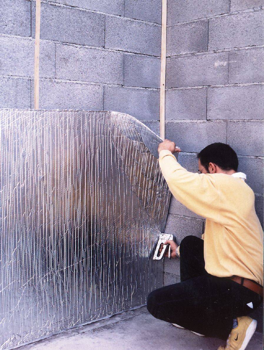 Наносится клеевой слой для последующей фиксации утеплителя. Приклеиваются теплоизоляционные плиты, изготовленные из минеральной базальтовой ваты или пенополистирола.