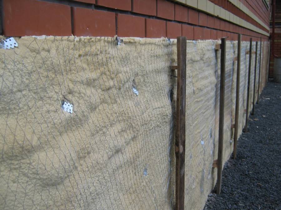 Напыление производится тонким слоем на заранее подготовленную поверхность. ППУ хорошо держится, образует ровный пластичный и водонепроницаемый слой, выполняет одновременно функцию гидроизолятора, не поражается насекомыми и грызунами.