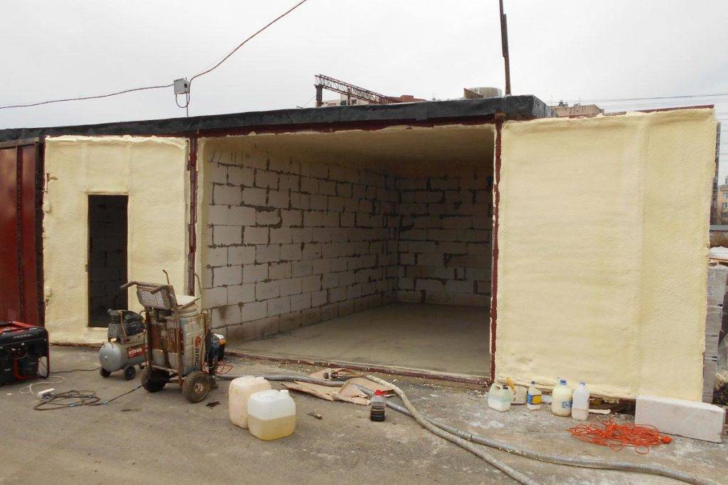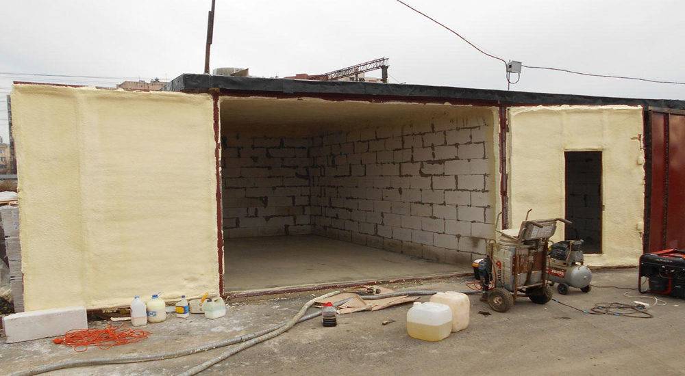 Пенополиуретан. Имеет популярность из-за своей стойкости к погодным условиям. После нанесения материал растягивается и заполняет все пустоты, а также надёжно прилипает к стене и потолкам, поэтому его не нужно дополнительно герметизировать. Для того, чтобы утеплить гараж при помощи пенополиуретана, необходимо использовать специальное оборудование, которое распыляет материал на стены в жидком виде, после чего он застывает и образует сплошные слои гидро- и теплоизоляции. К тому же материал не способен к возгоранию и его можно эксплуатировать до 50 лет.