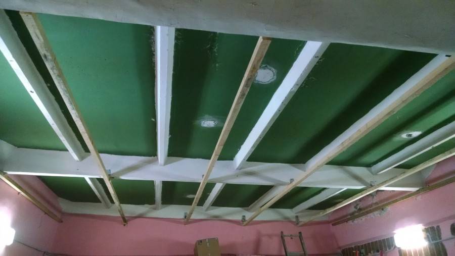 - Если потолок деревянный, то материал можно закреплять гвоздями. Если же верх бетонный, то необходимо сделать предварительный каркас, в котором и закрепляют пенопласт. В таком случае материал можно зафиксировать при помощи изоленты, а далее закрыть фанерой или вагонкой.