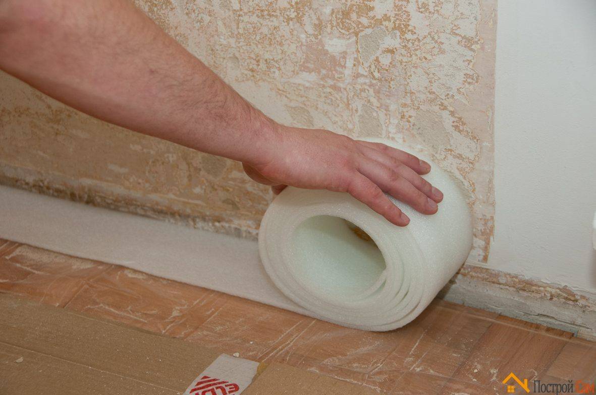 Перед началом работы тщательно очистите поверхность стен от остатков старой штукатурки и краски. Пол должен быть накрыт пленкой и закреплен на стене с помощью изоленты. На пленку укладывают демпферную ленту по периметру угла между стеной и полом.