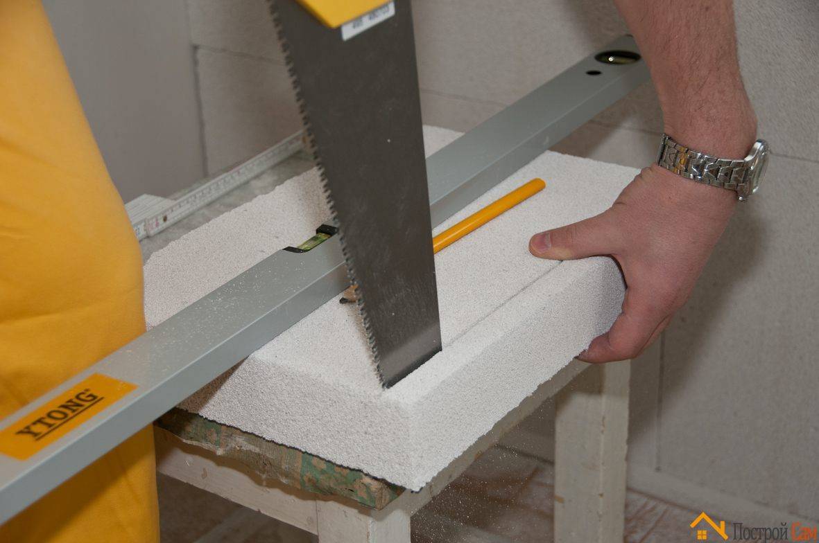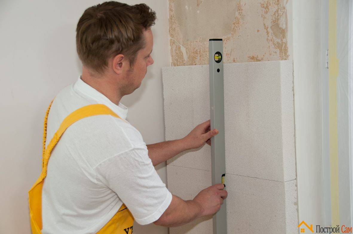 Осторожно прижимаем блок к стене, пододвигая его вплотную к предыдущему блоку. Проверьте уровнем, чтобы блоки были закреплены ровно
