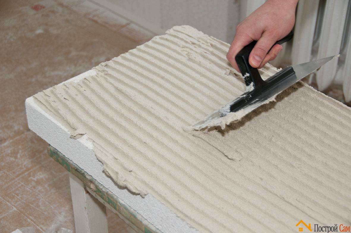 Готовый раствор распределяется по всей поверхности блока с помощью зубчатого шпателя.