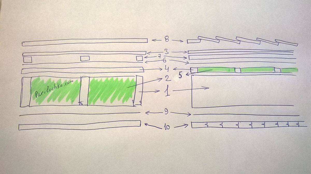 Материалы могут применяться различные, но структура «пирога» в любом случае одинакова. Она состоит из слоёв (сверху вниз):