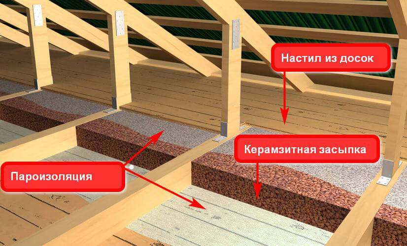 если у вас на полу есть балки перекрытия, их можно использовать для «бассейнов», куда будет засыпаться керамзит. Для прочности можно добавить доски толщиной 20-25 см нужной высоты и расположить их перпендикулярно к несущим балкам. Если несущие балки имеются только на крыше, то балки на полу должны быть их чуть более широким продолжением;